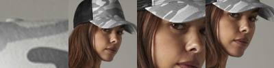 Polyester mesh rear panels. Camouflage detailing. 5 panel. Pre-curved peak. Retro style snapback size adjuster. Tear out label.