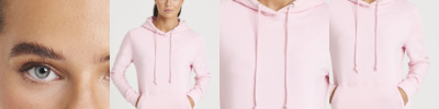 Soft cotton faced fabric. Brushed back fleece. Drop shoulder style. Girlie fit. Double fabric hood with self colour drawcord. Front pouch pocket with ribbed edge.