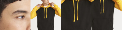 Soft cotton faced fabric. Brushed back fleece. Contrast raglan sleeves. Contrast double fabric hood with flat lace drawcord. Front pouch pocket. Ribbed cuffs and hem.