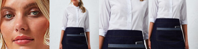 Mid-length denim waist apron with two large metal eyelets that secure the waist ties. Large centre pocket measuring 36cm wide with combined pen pocket. Contrast trim on pocket and ties gives a two-tone denim effect. 50cm long by 70cm wide. Washing Instructions Domestic wash 60°c. Industrial wash 85°c.