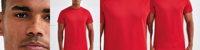 Performance T-shirt. Cationic dyed. Recycled polyester. Wicking fabric. Stretch. Crew Neck. Short Sleeve. Lightweight. Twin-needle stitching on hem and arms. Textured fabric. Product contains no branded neck or waist label. Removable Kimble or looped garment tags. Inner seam label holds important product information on one label with a second label containing brand information which can be cut-away.