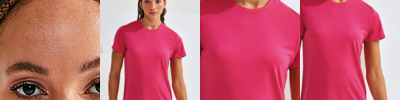 Performance T-shirt. Cationic dyed. Recycled polyester. Wicking fabric. Stretch. Crew Neck. Short Sleeve. Lightweight. Feminine fit. Twin-needle stitching on hem and arms. Textured fabric. Product contains no branded neck or waist label. Removable Kimble or looped garment tags. Inner seam label holds important product information on one label with a second label containing brand information which can be cut-away.