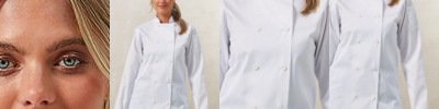 Women's fitted chefs jacket. Long sleeved. 10 button hole wrap-over fastening. Panelled back for more fitted style. Left sleeve pen pocket. Mandarin collar. Made from OEKO-TEX Standard 100.