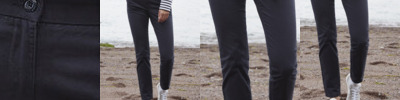 Flat front chino trouser. Tag free. Stretch fabric for ease of movement. Slanted front pockets, 2 back welt pockets, belt loops plain hem. BSCI certified.